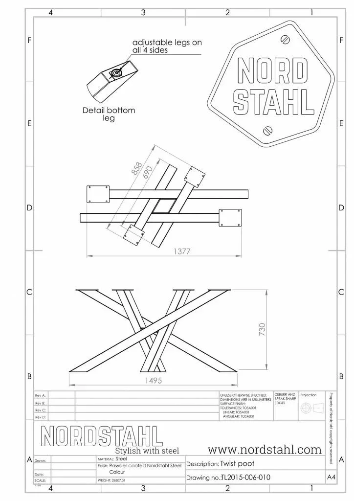 Dankzij de verstelbare stelvoetjes staat de poot stabiel op elke ondergrond. En het mooiste? Dit demontabele model bestaat uit vier losse kokers die je in het midden met elkaar verbindt. Zo verandert je tafel vanuit elke hoek nét even van uitstraling.